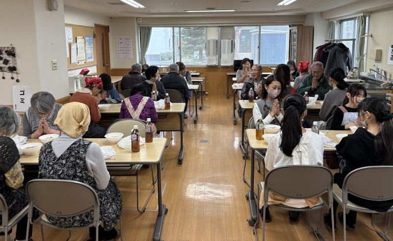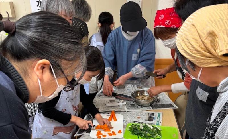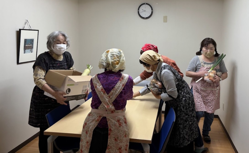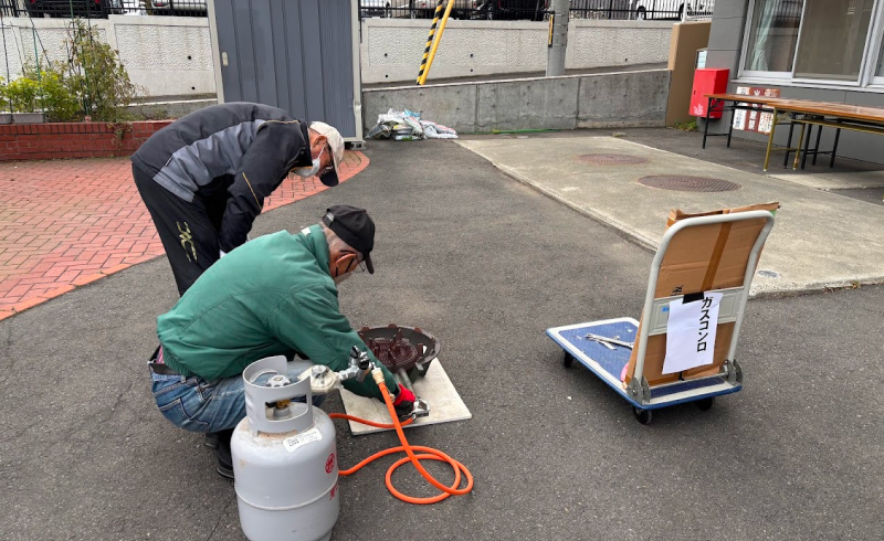 今回の訓練は、地震が発生してガスは使用不可、水道と電気は一部使用可という設定で、施設内から備品を集めて豚汁を作るという内容でした。